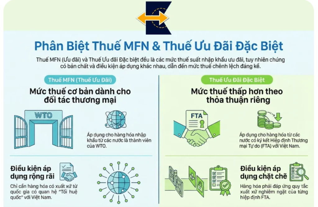 Việc phân biệt đúng thuế MFN và thuế ưu đãi đặc biệt giúp doanh nghiệp lựa chọn chính xác mức thuế nhập khẩu áp dụng, tối ưu chi phí và hạn chế rủi ro sai sót khi khai báo hải quan.